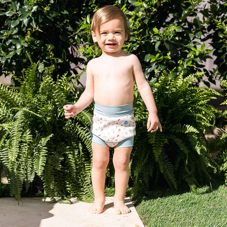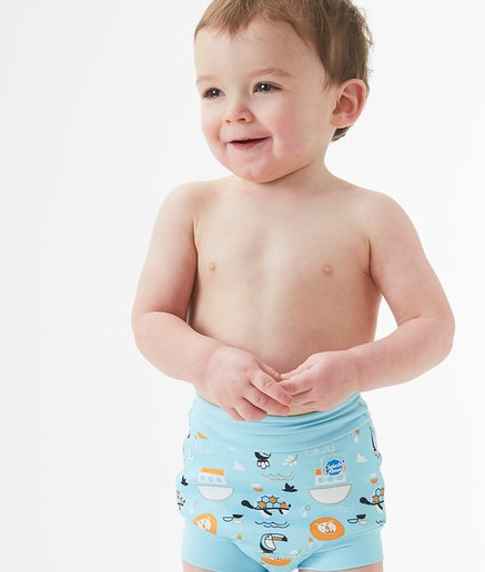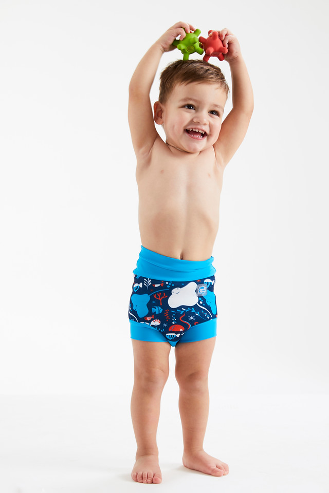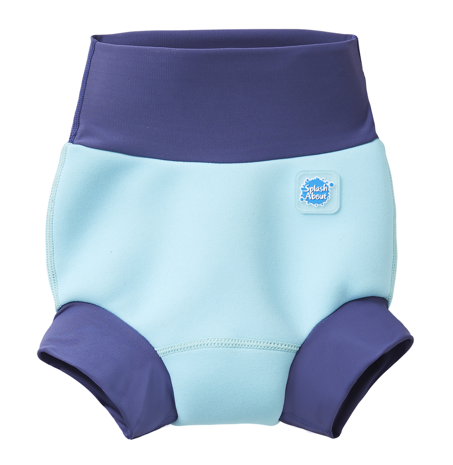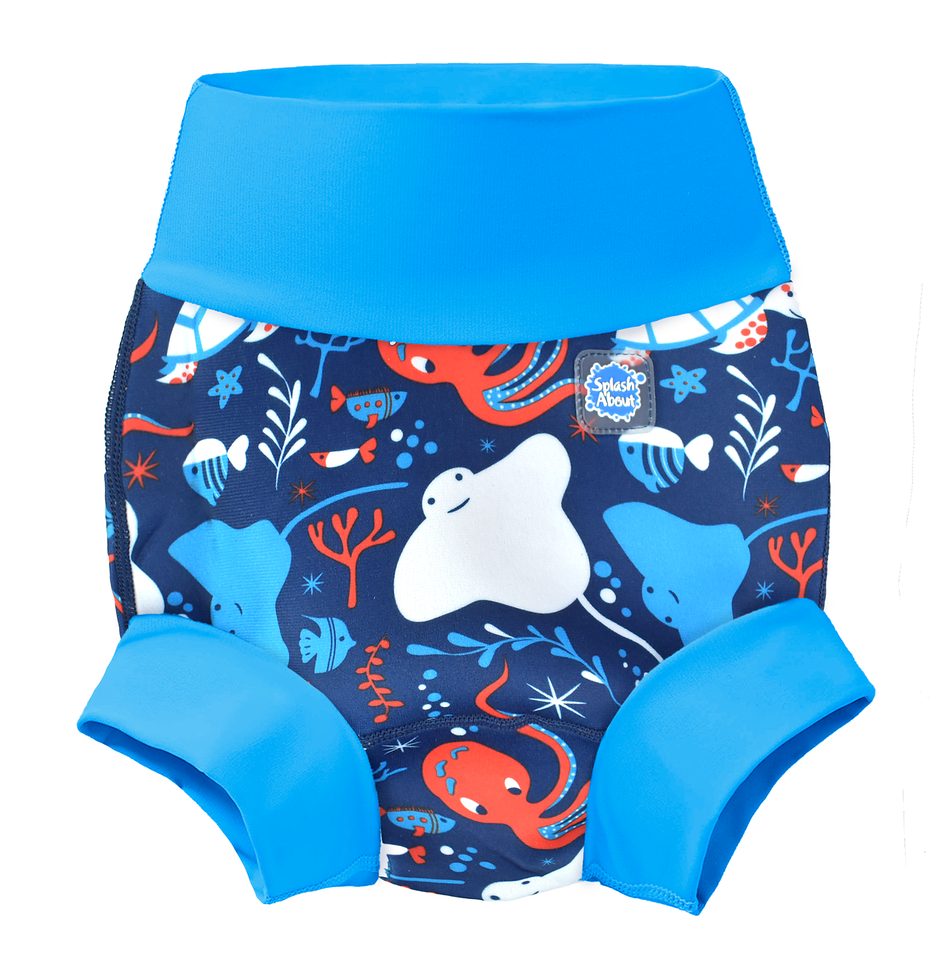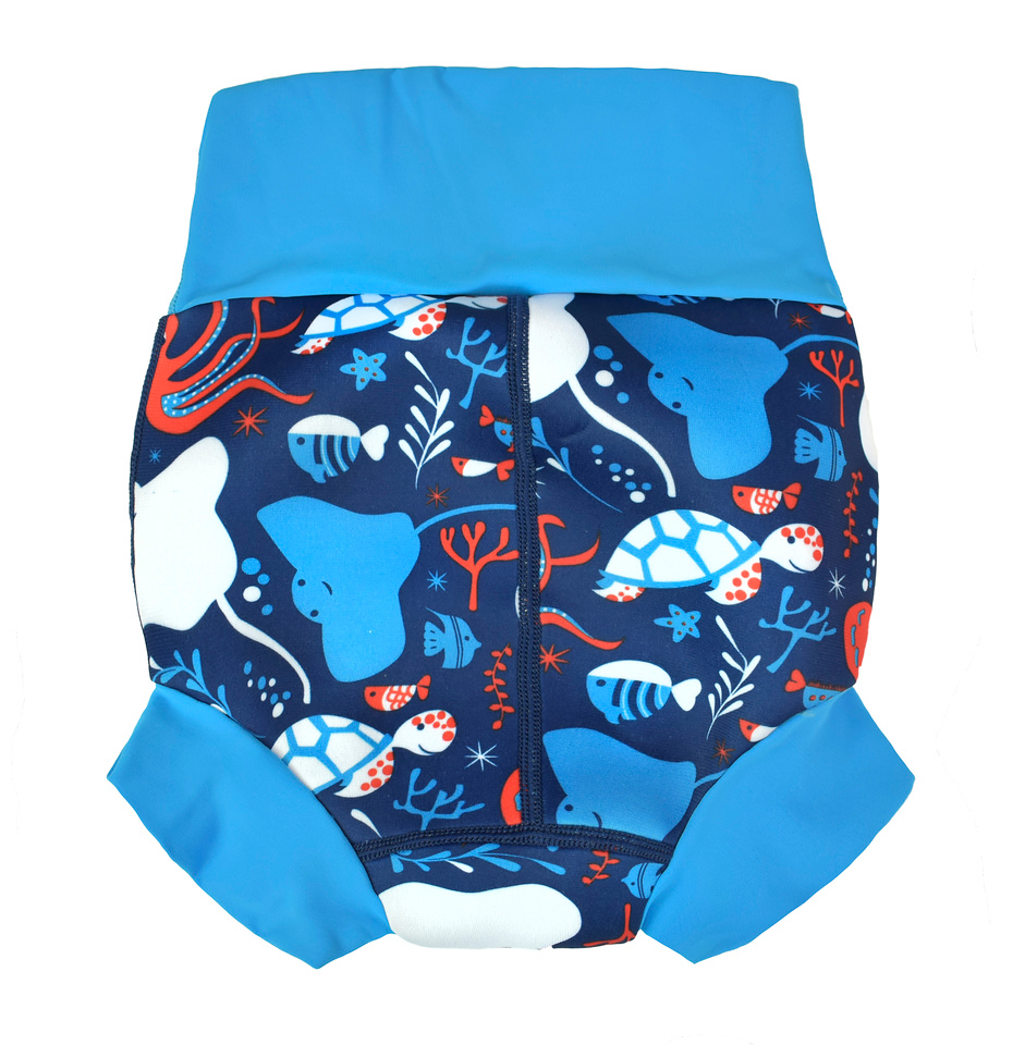 We thoroughly recommend this new and improved 'Happy Nappy' neoprene swim nappy. With it's innovative, unique 3d shape, it moves with your baby as they kick and splash, rather than gaping at the back as other nappies can often do. To comply with our 'double nappy' policy wear one over an environmentally friendly Eco NappyWrap & Liner, or a disposable swim nappy. Please note that these nappies are designed to be a snug fit at the waist and thighs. Blue dinosaur pirate print.