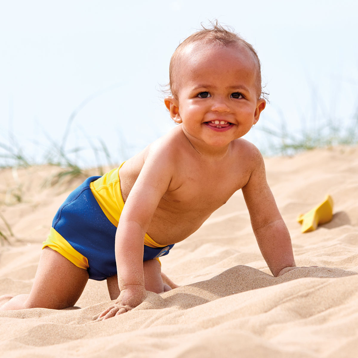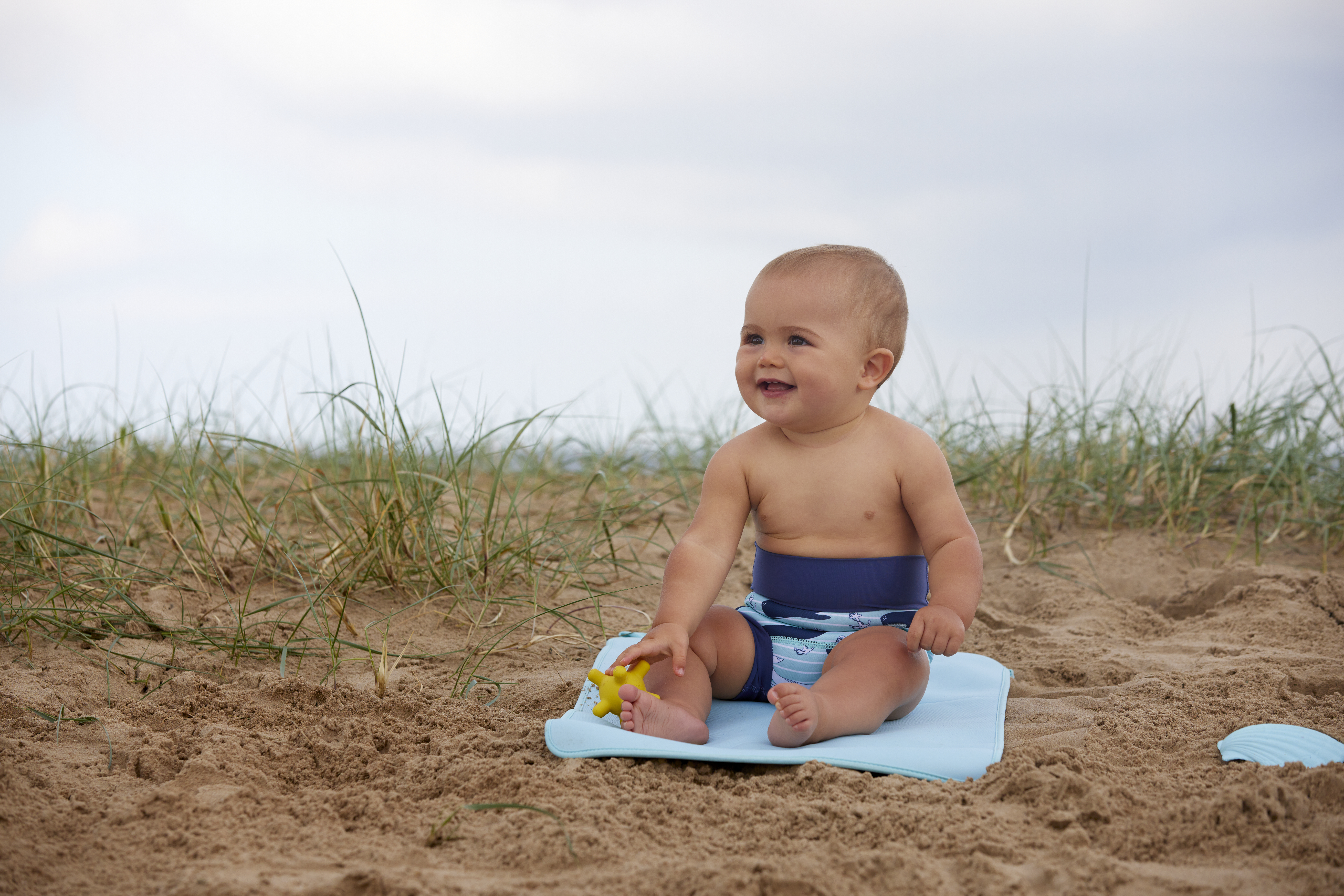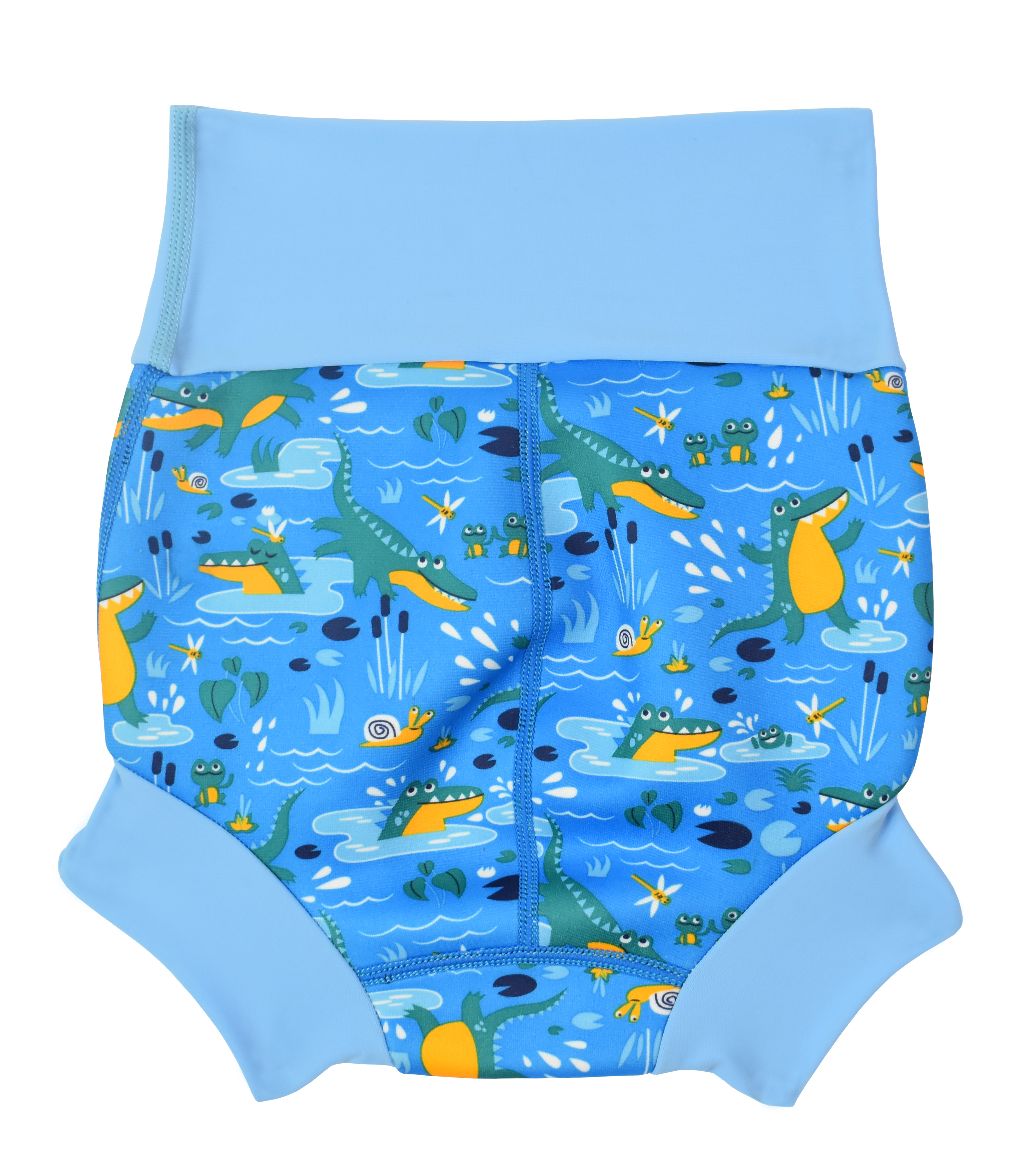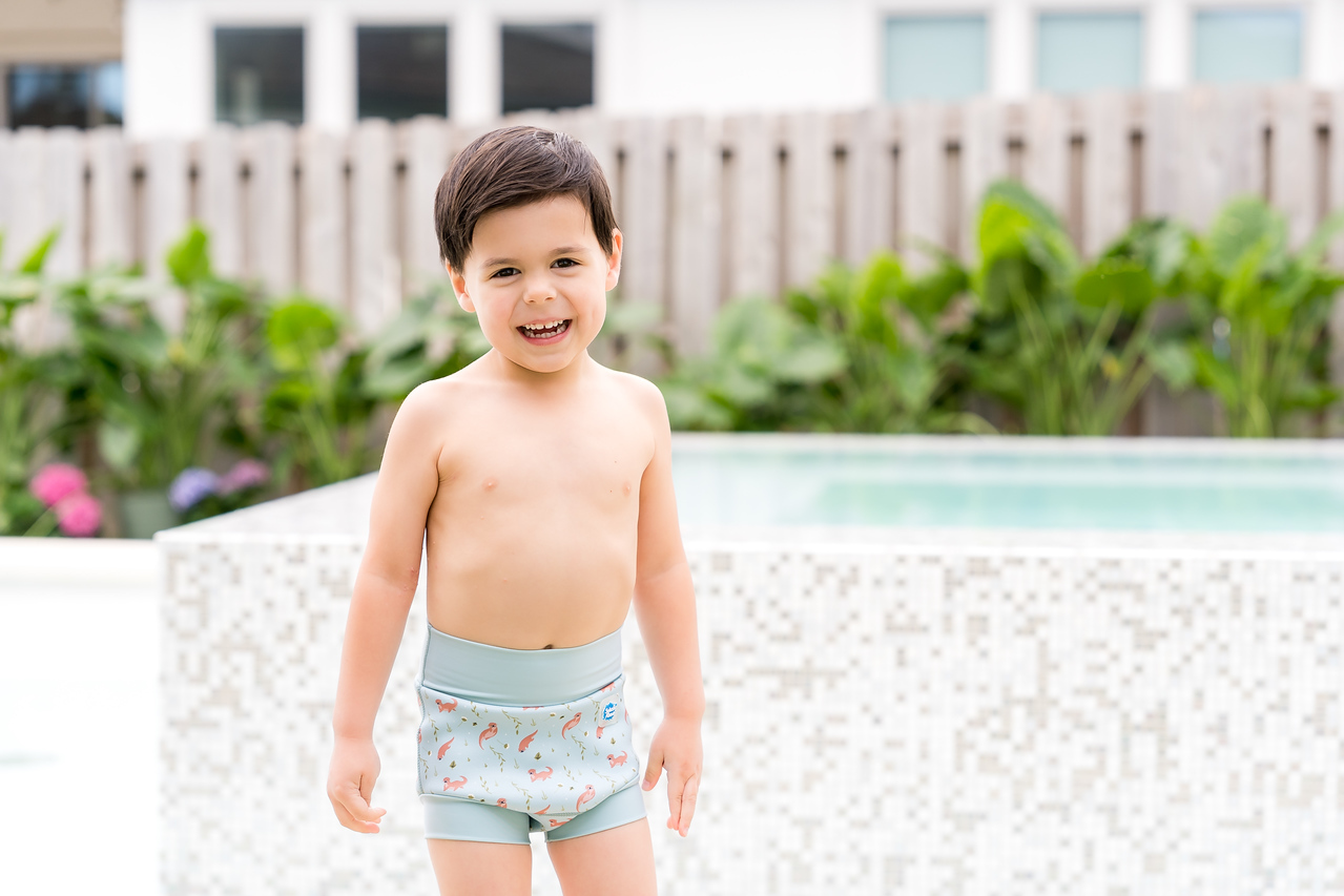 We thoroughly recommend this new and improved 'Happy Nappy' neoprene swim nappy. With it's innovative, unique 3d shape, it moves with your baby as they kick and splash, rather than gaping at the back as other nappies can often do. To comply with our 'double nappy' policy wear one over an environmentally friendly Eco NappyWrap & Liner, or a disposable swim nappy. Please note that these nappies are designed to be a snug fit at the waist and thighs. Blue dinosaur pirate print.