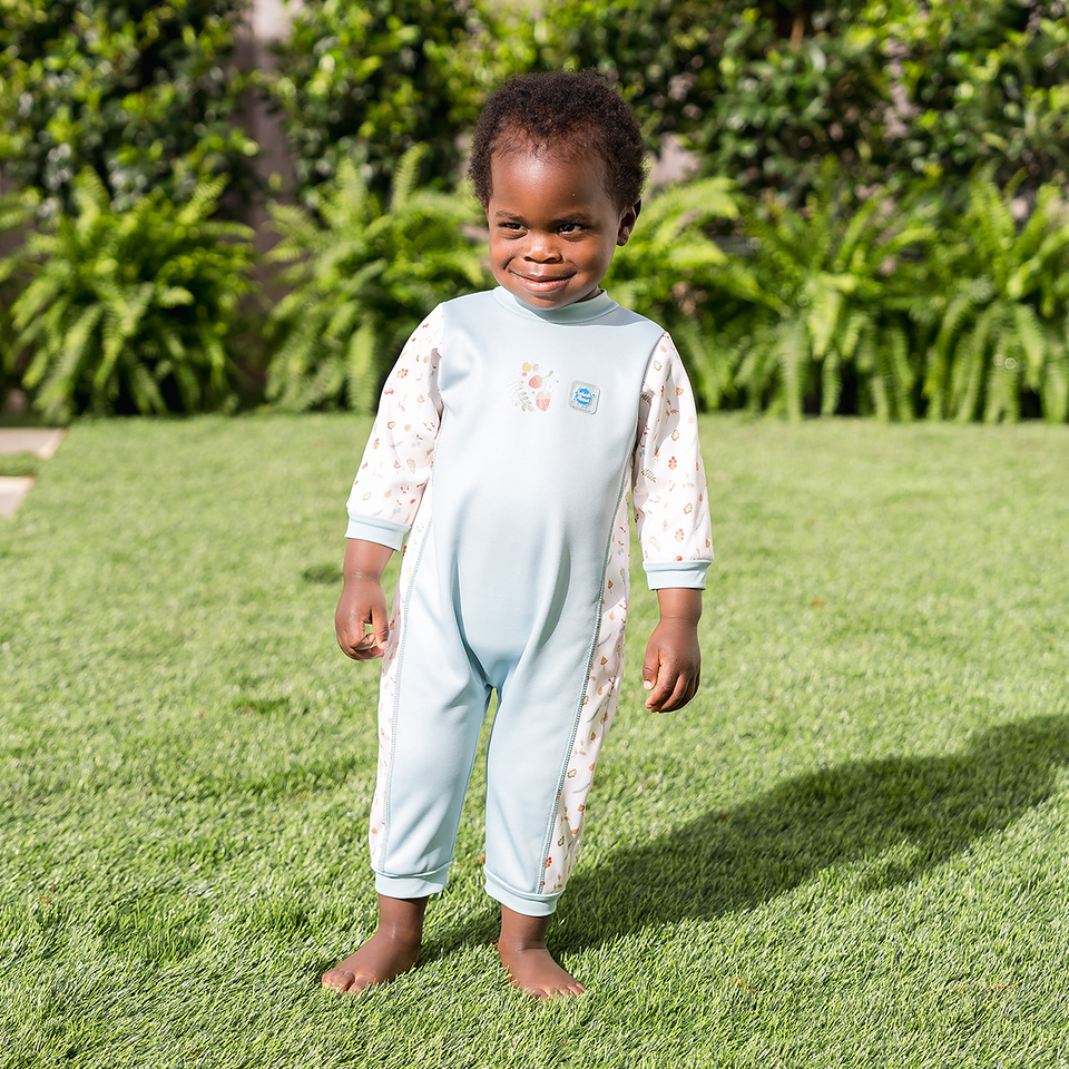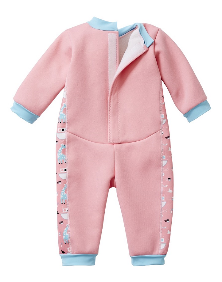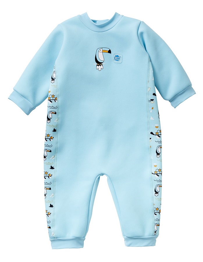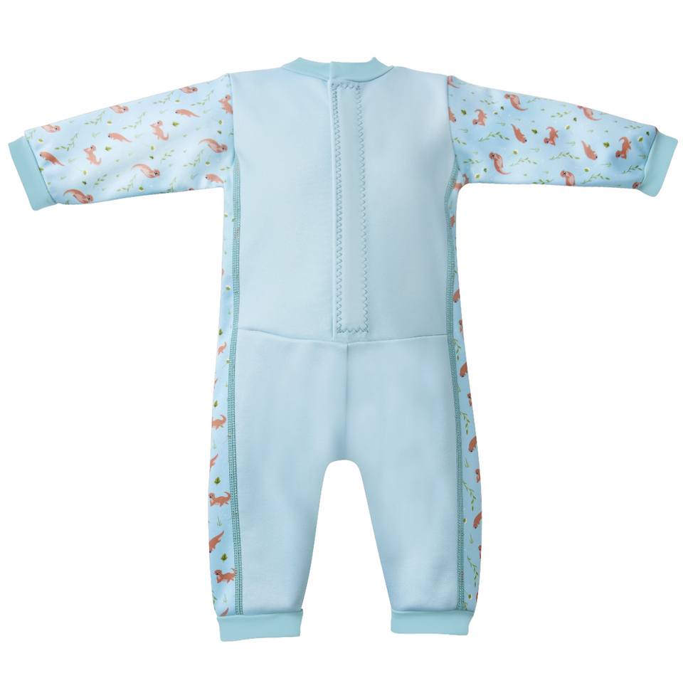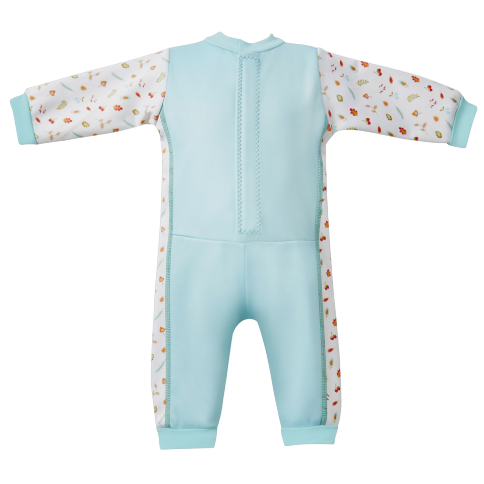 This 'Warm In One' wetsuit has long sleeves and legs and is fleece lined for extra warmth. It's perfect for children that are sensitive to cooler pools and will significantly extend the time that they are happy to spend in the water. Made from super soft 3mm neoprene, it is designed to block in barrier cream for those that need it so is great for babies with sensitive skin conditions such as Eczema. There are no changing room traumas as it is easy to put on and take off due to the deep back velcro opening which also provides plenty of growing room. Wear with one of our Puddle Ducks neoprene swim nappies with an 'Eco Swim NappyWrap & Liner' (or a disposable swim nappy) underneath to fully comply with our double nappy policy. Pale blue with 'Noah's Ark' print side panels.